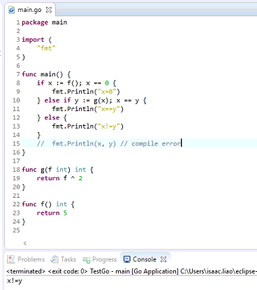 This example shows we can declare x and y in "if-else" scope, the the variable is not available out of "if-else" scope