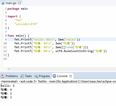 - Built-in function len returns the number of bytes, not runes in a string