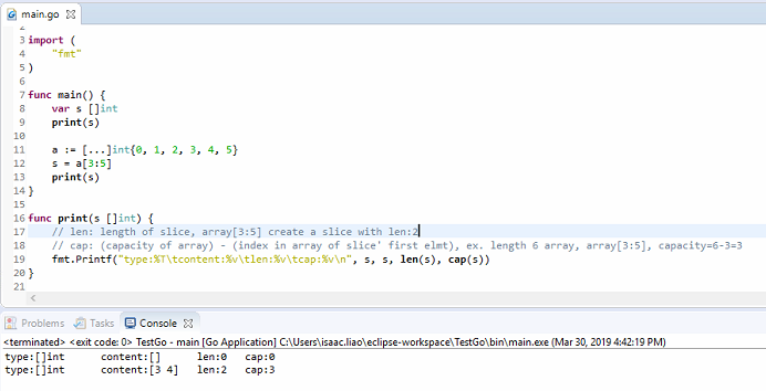 - Declare a slice by make([]int,length,capacity)