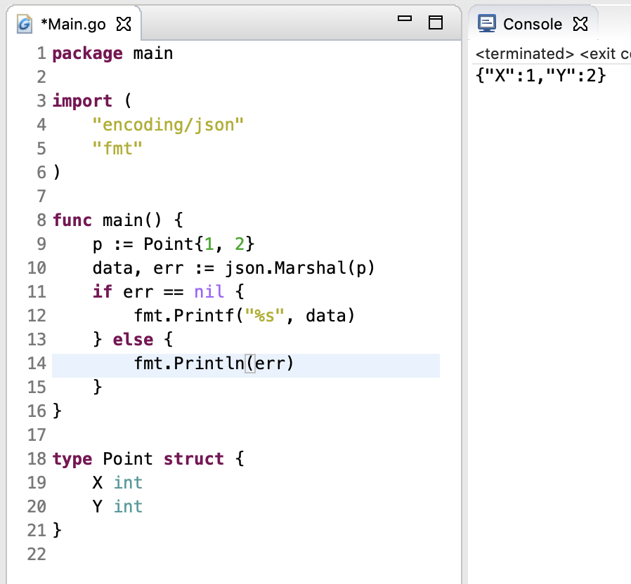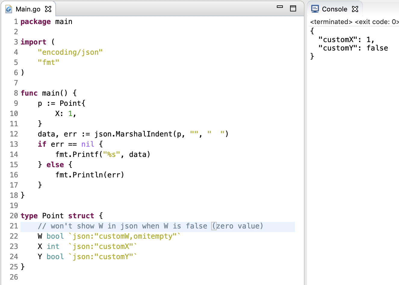Ex. type S struct {num int `json:“release”`, real bool `json:“ok,omitempty”`}