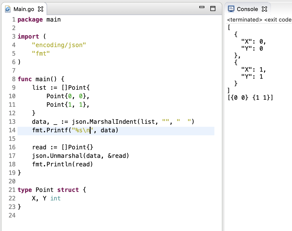 Ex.data, err = json.MarshalIndent to format jaon. Use fmt.Printf(”%s”,data) to print to string