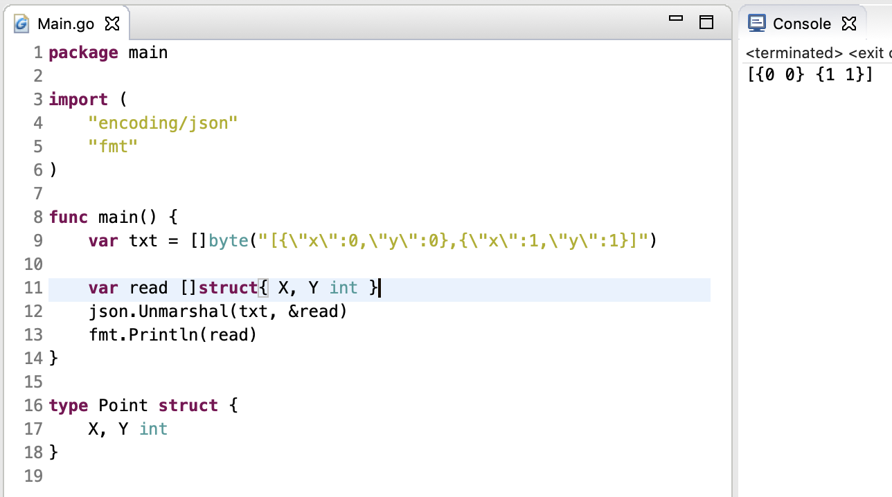 Ex. type Person struct {Name string}; ps := json.Unmarshal(json)