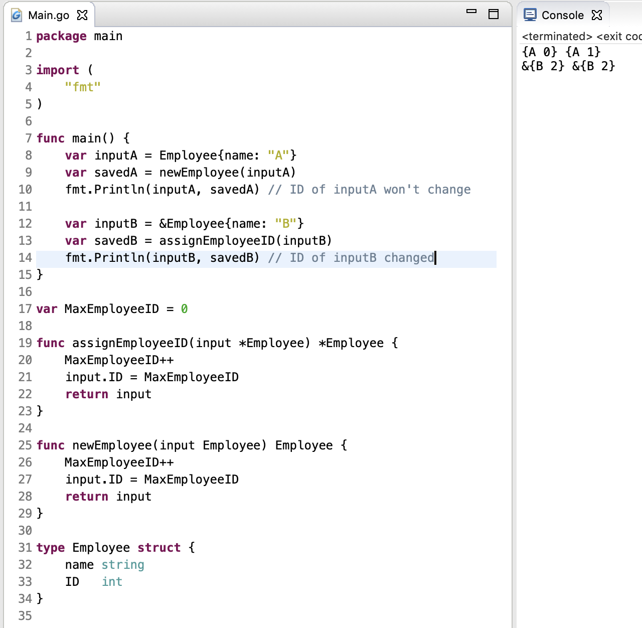 - Ex. a := &Point{1,2}b := &Point{2,1}fmt.Println(a == b) //false// same asfmt.Println(a.x == b.x && a.y == b.y) //false