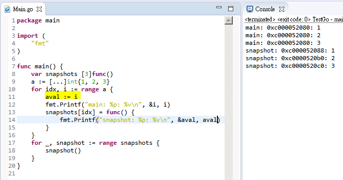 - Loop will reuse variable address, so a new variable must be declared to get loop variable value if the value will be used later in closure
