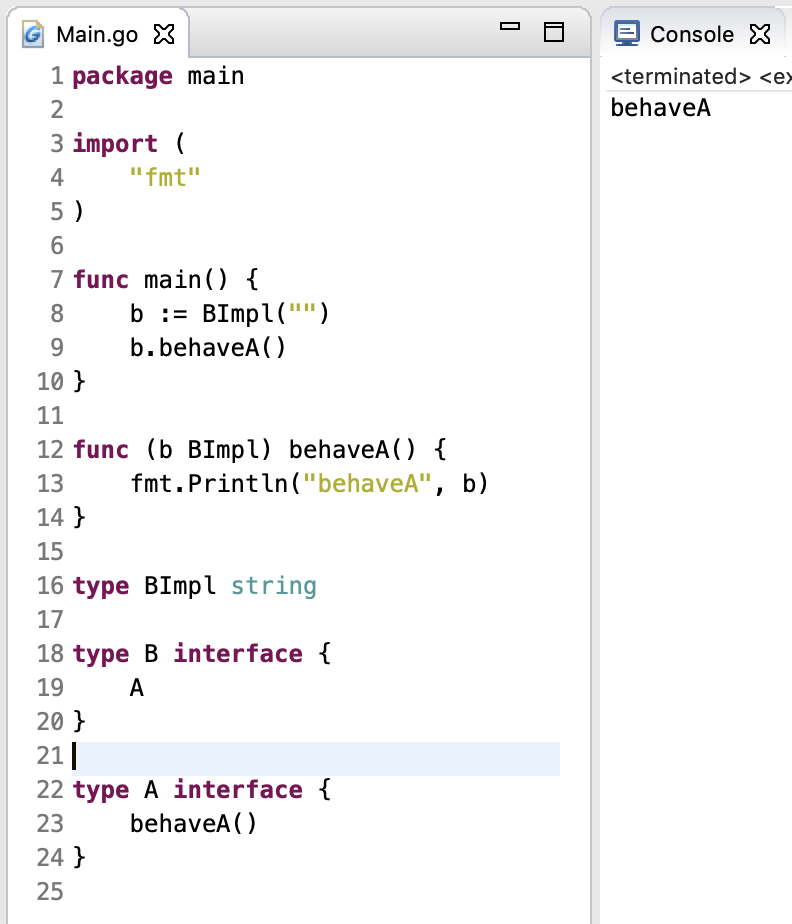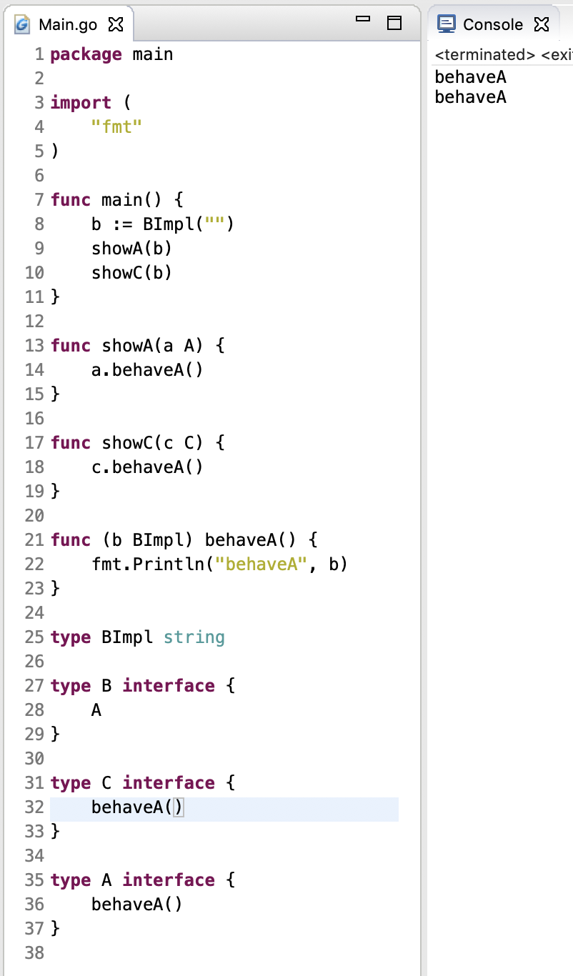 Go - Interface Embedding Declare embedding interface No problem if two interfaces have same method Share on X Facebook LinkedIn Bluesky Previous Next