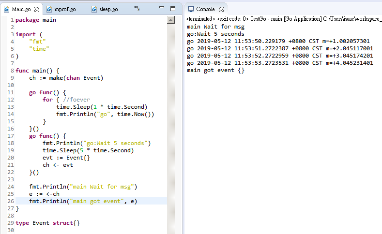 - Ex. main wait for response until goroutine send msg