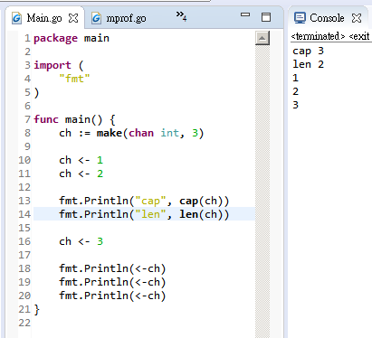 Go - buffered channel Declare a queue: ch := make(chan int, 3) Block send when full, block receive when empty Get capacity: cap(ch) Get currently buffered: len(ch) Buffered channel behaves as a queue, but should use slice if only need a queue Share on X Facebook LinkedIn Bluesky Previous Next