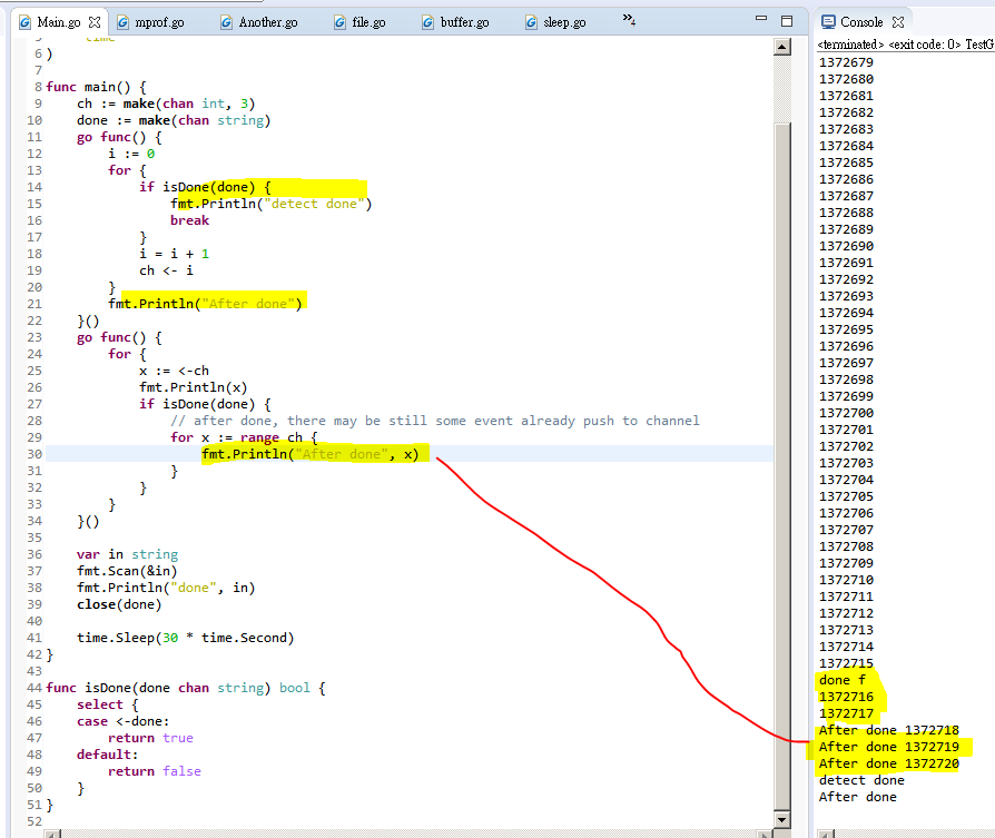 - This example shows when "done" channel is closed, there is still some work not done, some new messages are sent to channelSo need consume all messages from channel when a "done channel" is closed