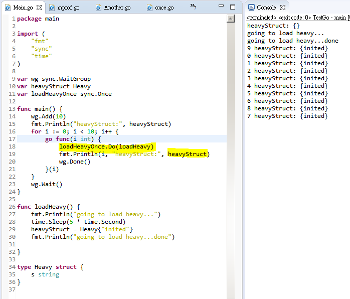Go - lazy initialized by sync.Once Ex. sync.Once.Do Can code "loadHeavyOnce everytime before read the variable", it will be executed once actually. Share on X Facebook LinkedIn Bluesky Previous Next