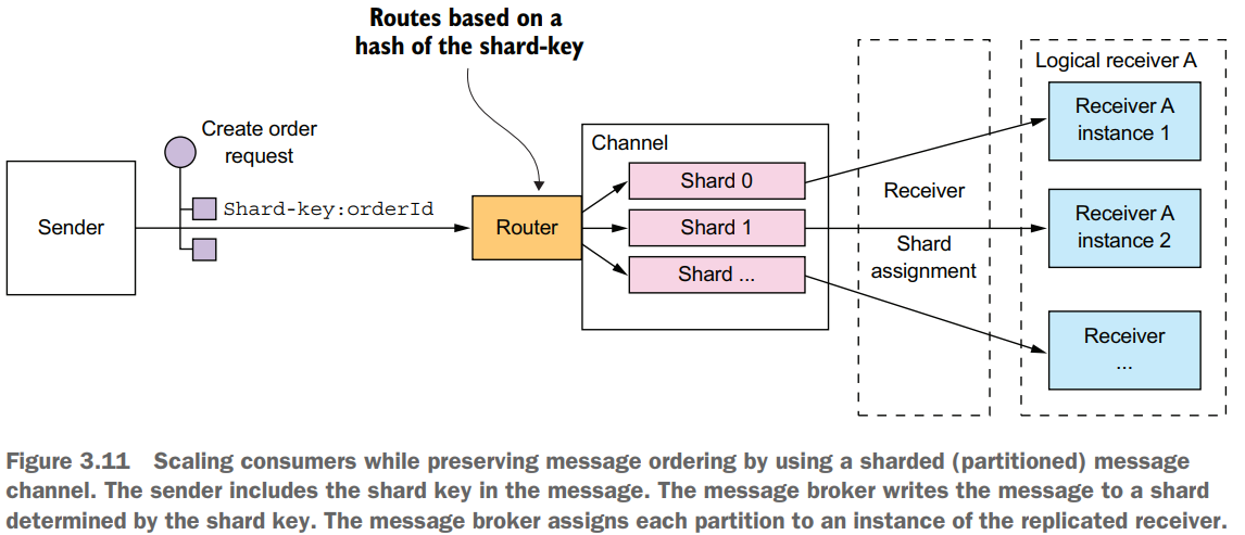 - how to scale out message receivers while preserving message ordering => use sharded (partitioned) channels in Kafka