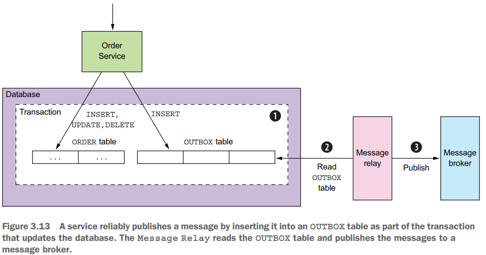 Publish messages by polling the outbox in the database. See http://microservices.io/patterns/data/polling-publisher.html.