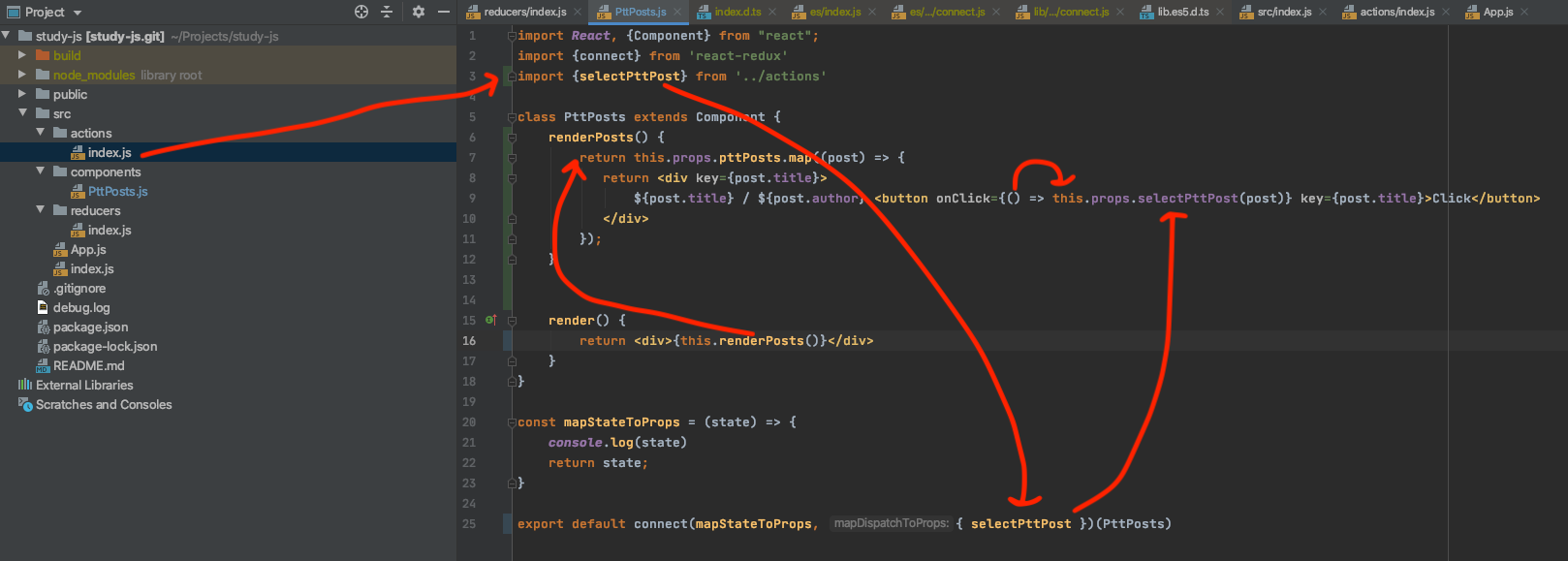 在 render function 裡印出 this.props -> 傳入 connect 之後,actionCreator function 就會被加到 this.props 裡面